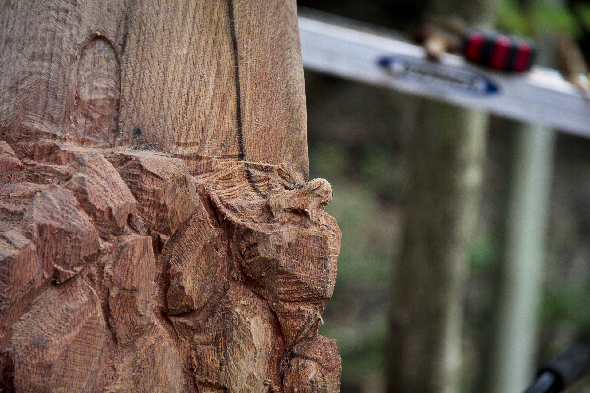 Unfortunately, the homeowners lost their beloved dog to a coyote the week before, so we added him to the carving looking out toward the house.