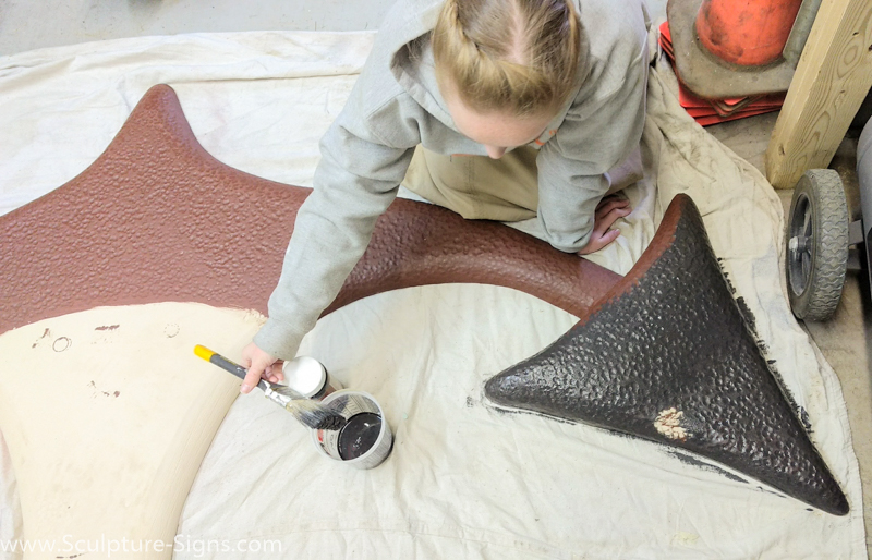Next, we carved and textured all the wood grain and hammered metal texture and began base coats of paint.