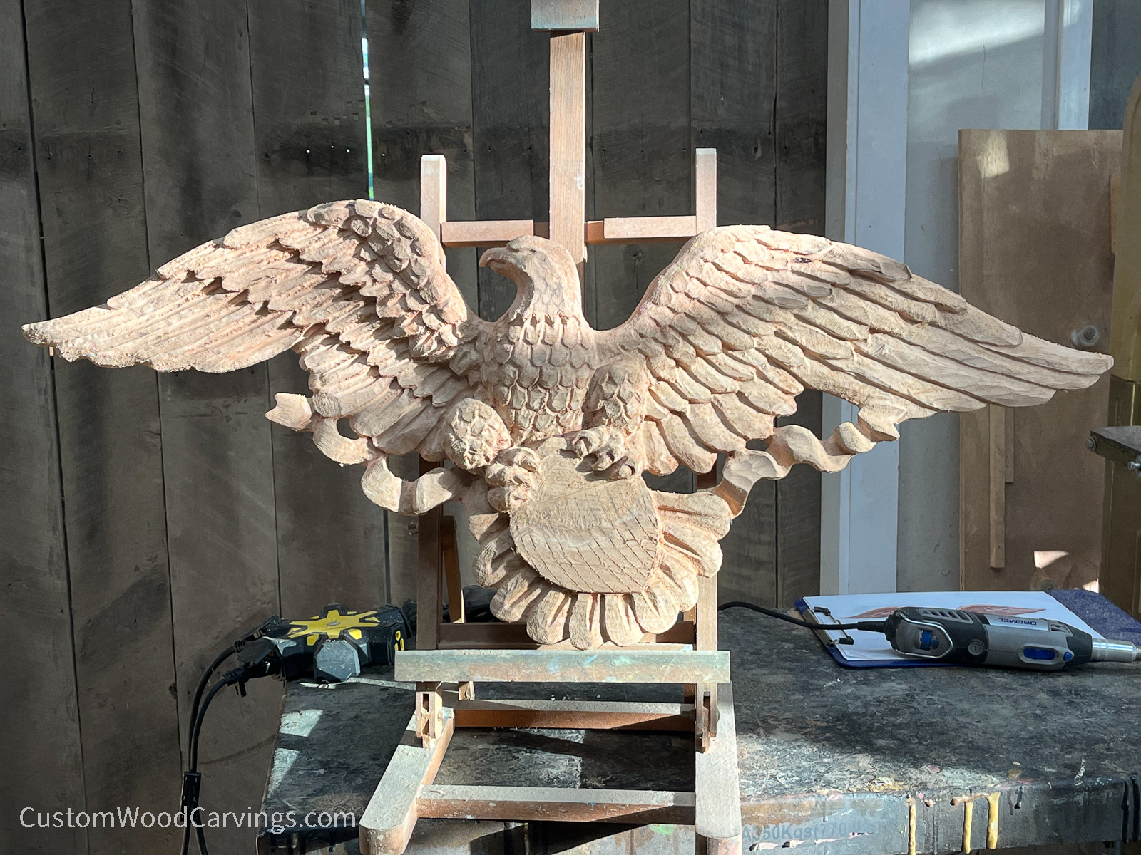 For this sculpture, because it is much smaller than most of my sculptures, I used my CNC machine to do the rough-out carving. From there I did most of the detail carving with angle grinders and dremels. I referred to his guideline photo often during the carving process.