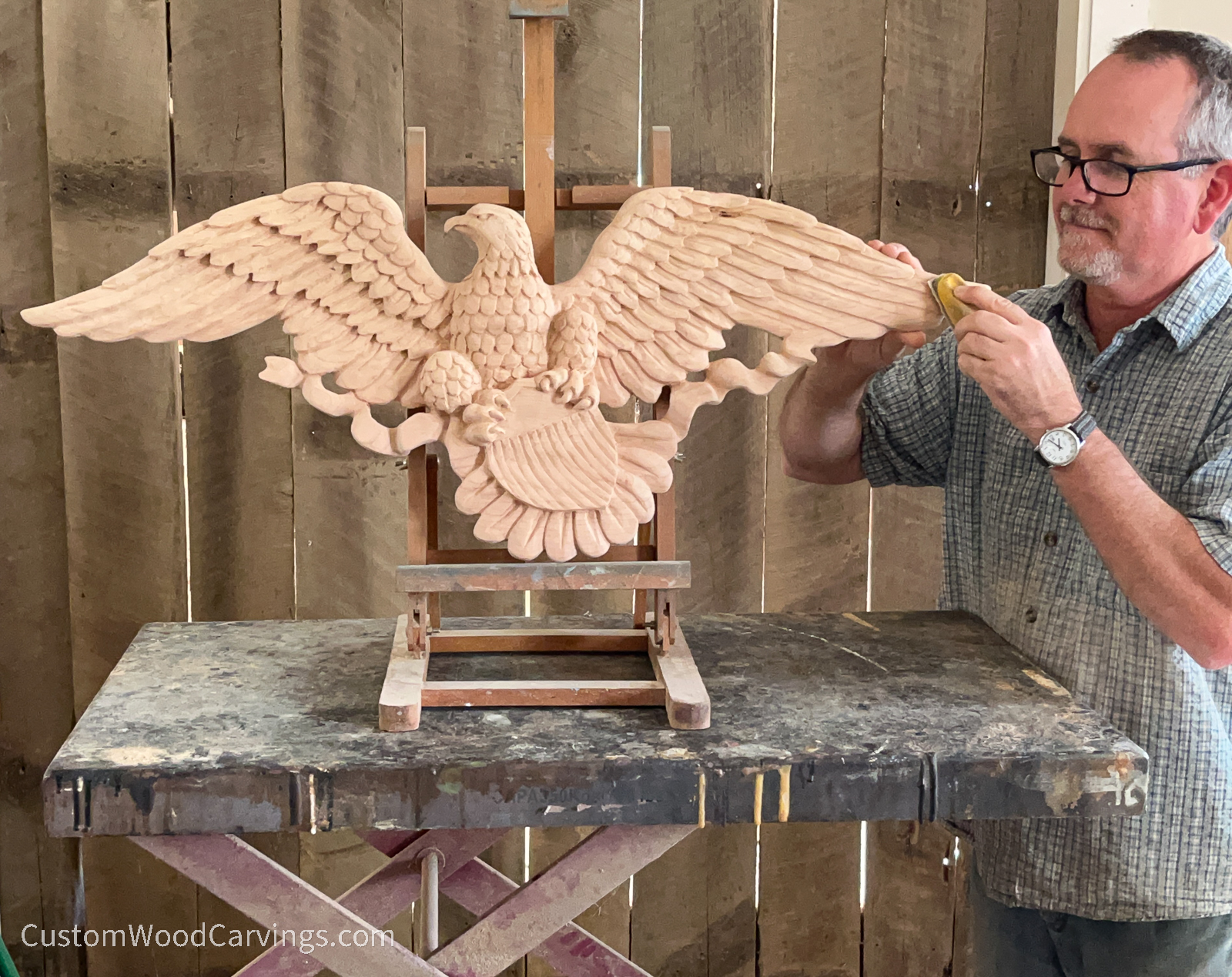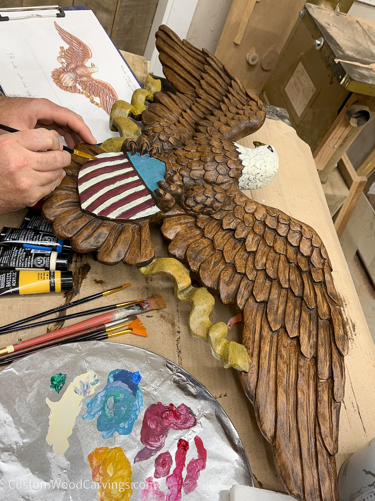 After lots of sanding, I stained and finished the eagle and started painting the colored areas. I was aiming for a muted, antique look with the colors rather than bright, totally opaque colors.