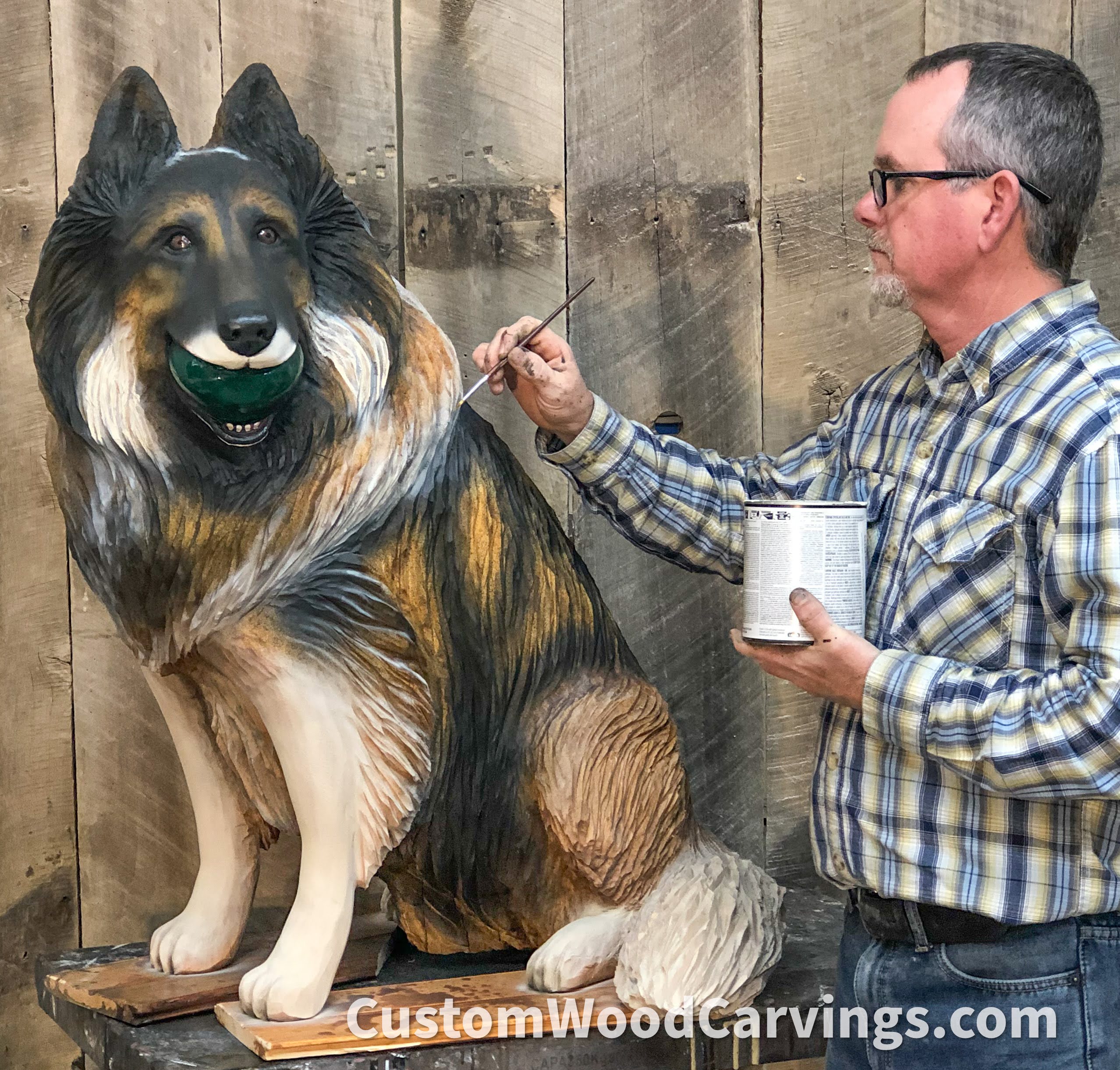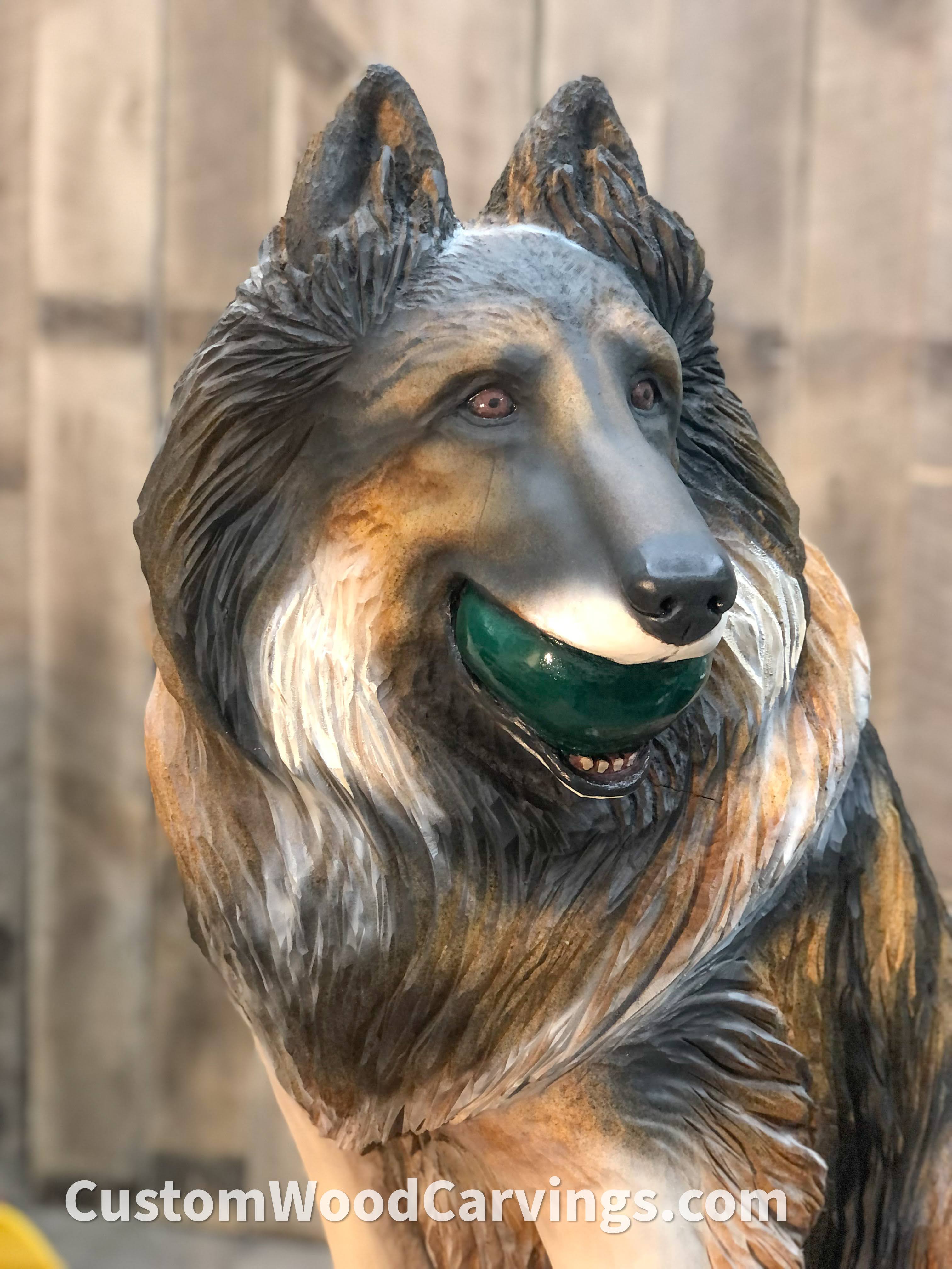 I stained the carving as a base coat, then airbrushed and hand painted the dog’s markings on, referring to the pictures the owner sent.